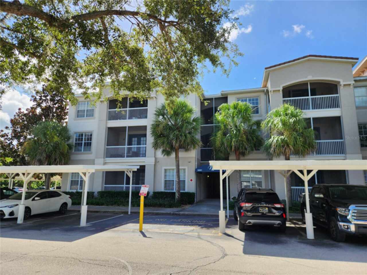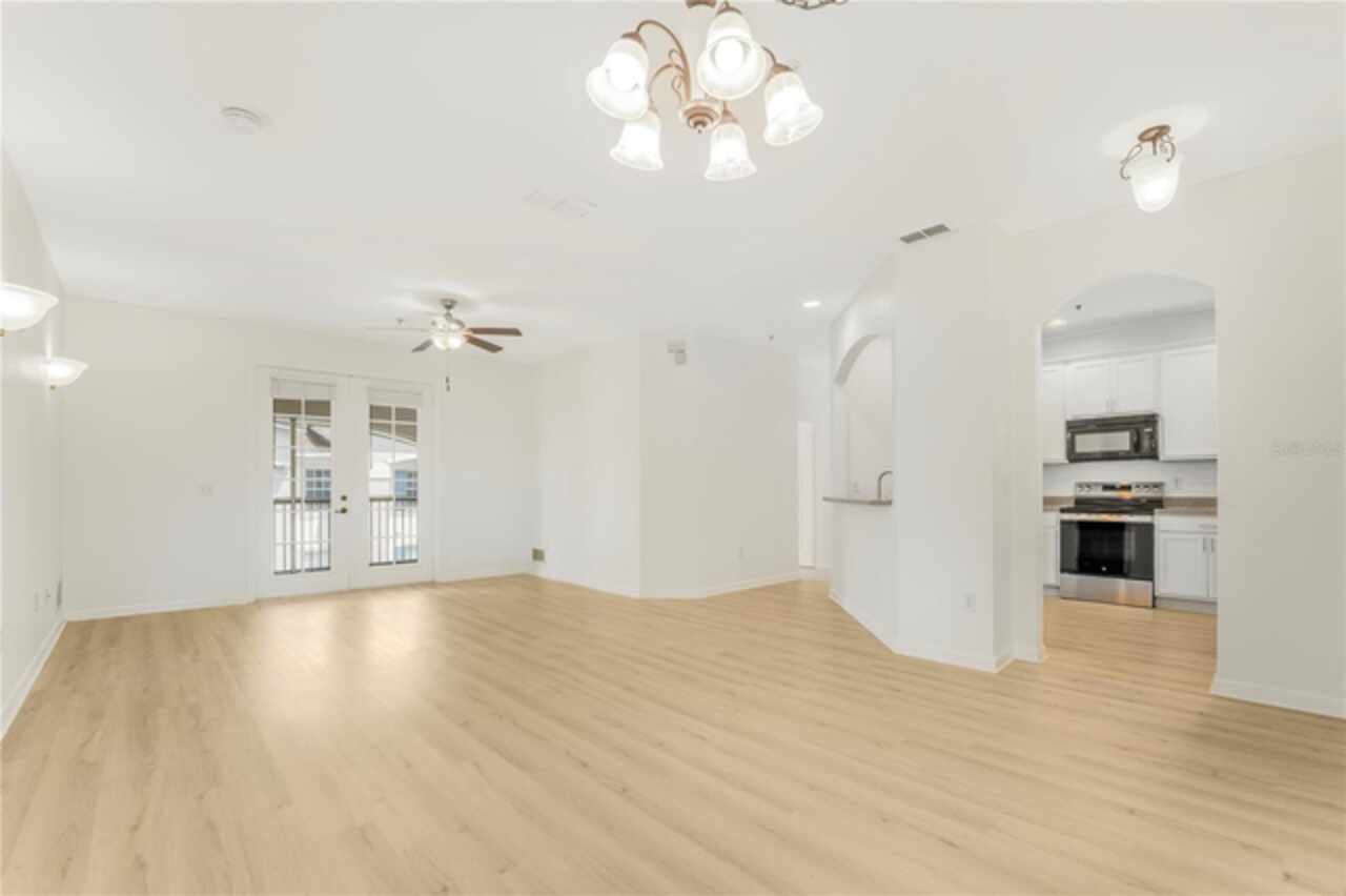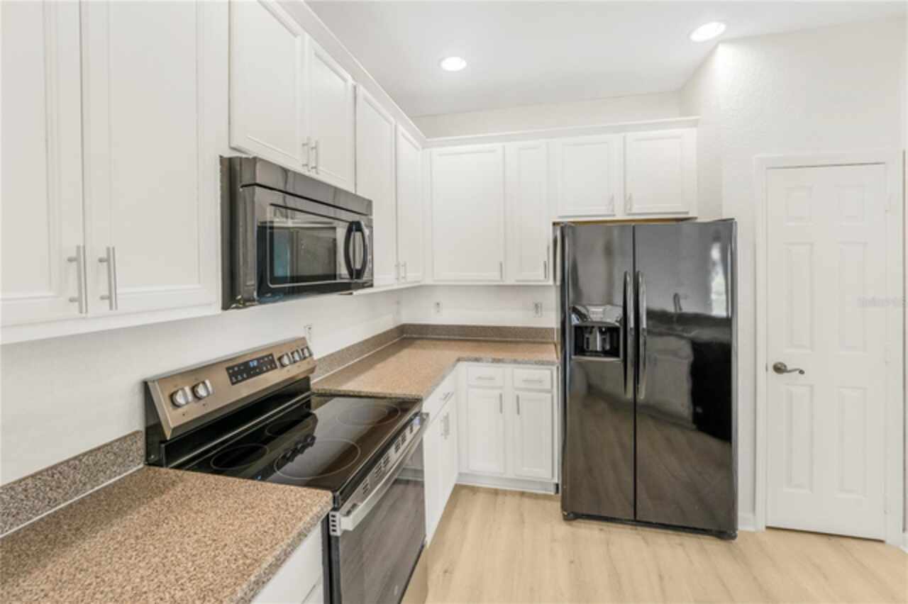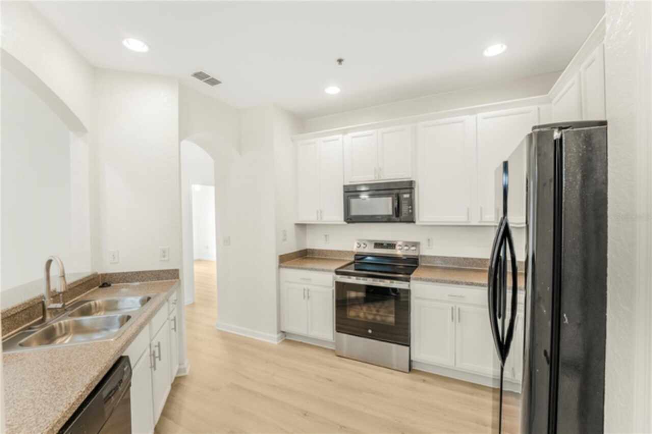 Newly Renovated! This is a cozy and very spacious 3-bedroom/2-bath condo in the desirable Flora Ridge gated community on the 3rd floor with convenient elevator access. Featuring split floor plan, luxury vinyl flooring throughout the unit and lots of natural light. The kitchen has a breakfast nook, new sink, faucet and stainless-steel range. Ceiling fan is in the living room and each bedroom. Laundry room has washer and dryer included. Primary suite features a large walk-in closet, a very large bathroom with his and her sink. The screened-in patio is perfect for relaxing and entertaining family and friends. The community features a pool, parks and walking trail. Located near major highways with easy access to Disney, restaurants, shopping, many Attractions and entertainment. Rent includes, assigned covered parking, trash, sewer and lawn care. This one is just waiting for you to call home!!