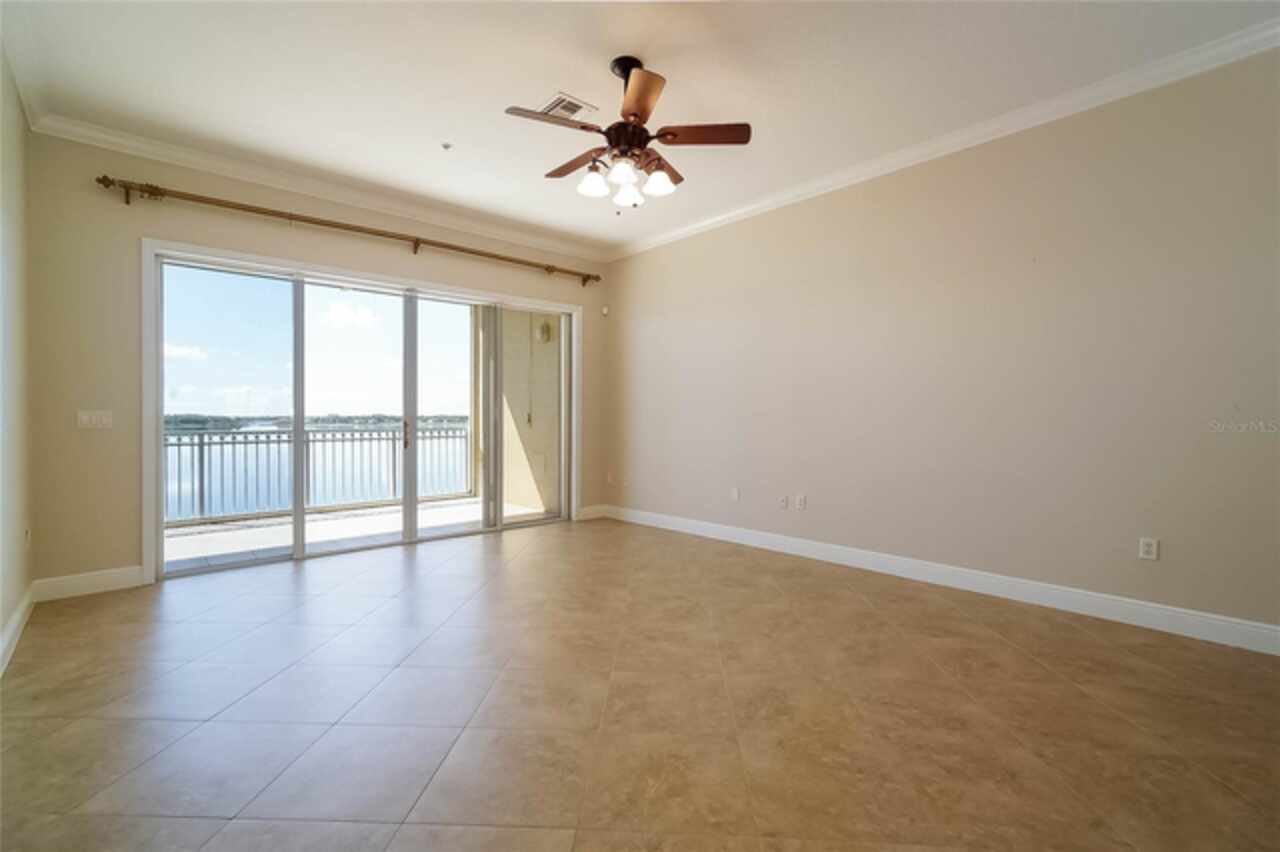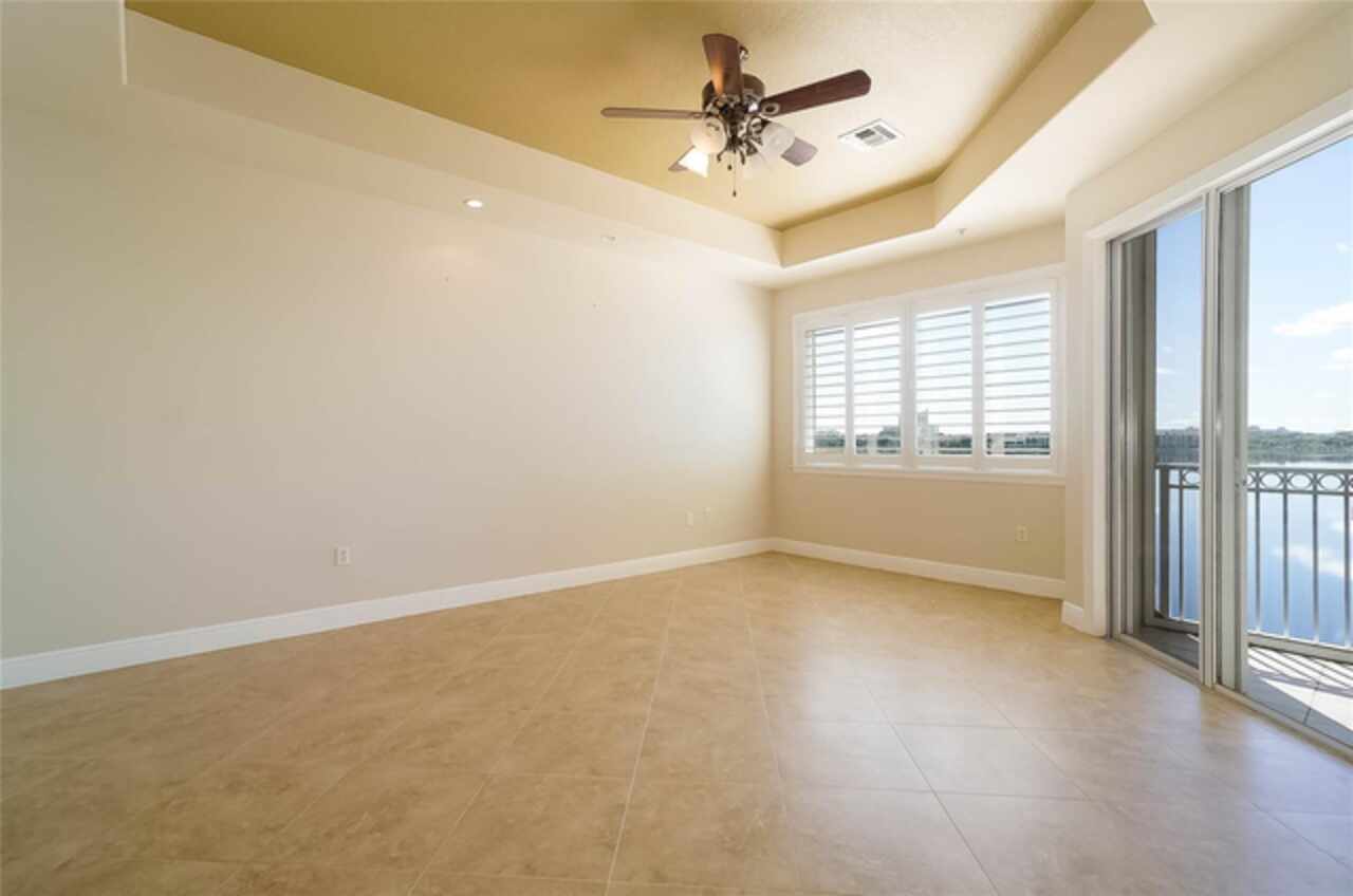 One or more photo(s) has been virtually staged. Welcome to luxury lakefront living at Vizcaya! This 2-bedroom, 2-bath condo is perched on the 3rd floor and offers breathtaking views of Big Sand Lake right from the balcony, complete with a motorized screen for year-round enjoyment. Inside, high ceilings, crown molding, tile floors, and plantation shutters set a sophisticated tone. The updated kitchen is a chef’s delight, featuring modern-style cabinetry, stainless steel appliances, convection ovens, built-in microwave, and a charming breakfast nook with a passthrough to the spacious great room. The formal dining area is accented by a stylish modern light fixture and flows seamlessly into the living room and out to the balcony overlooking the water. The primary suite is a retreat of its own with a tray ceiling, balcony access, a large custom walk-in closet, and a spa-like bath complete with dual vanities, soaking tub, glass-enclosed shower, and private water closet. The secondary bedroom offers generous space with a deep closet and convenient access to the second full bath. A well-appointed laundry room adds function with built-in cabinetry, wood shelving, and a utility sink. This rental includes one assigned garage space under the building, an additional outdoor parking spot, and a storage unit. Community amenities include a fitness center, lakefront pool, and tennis courts. Perfectly located, you’re just a short stroll to Restaurant Row and minutes from world-class shopping, attractions, and the airport—all within the security of a 24-hour guard-gated entrance.