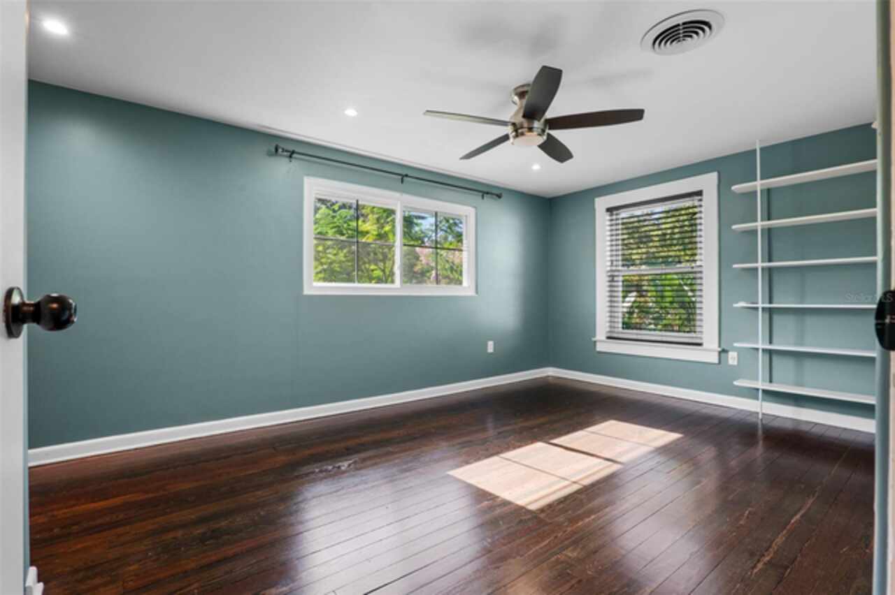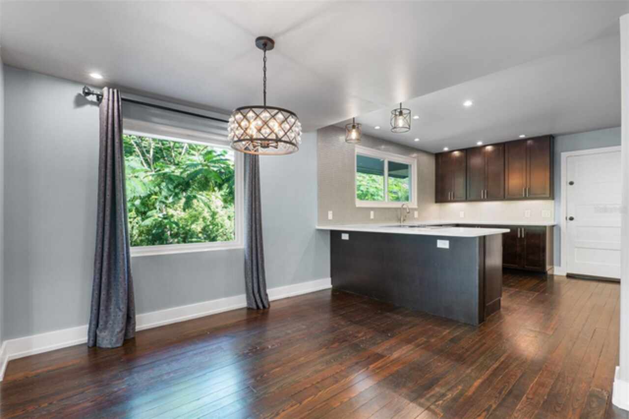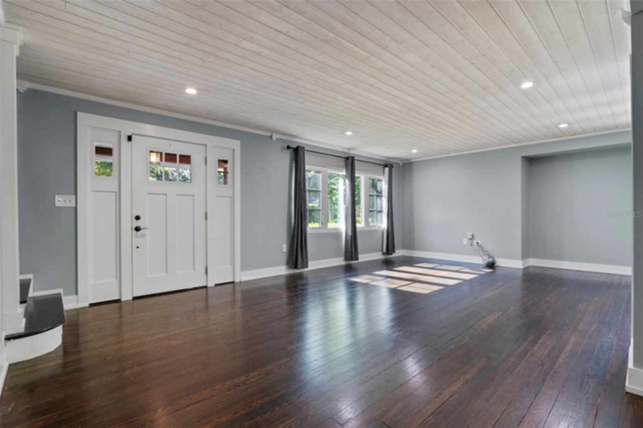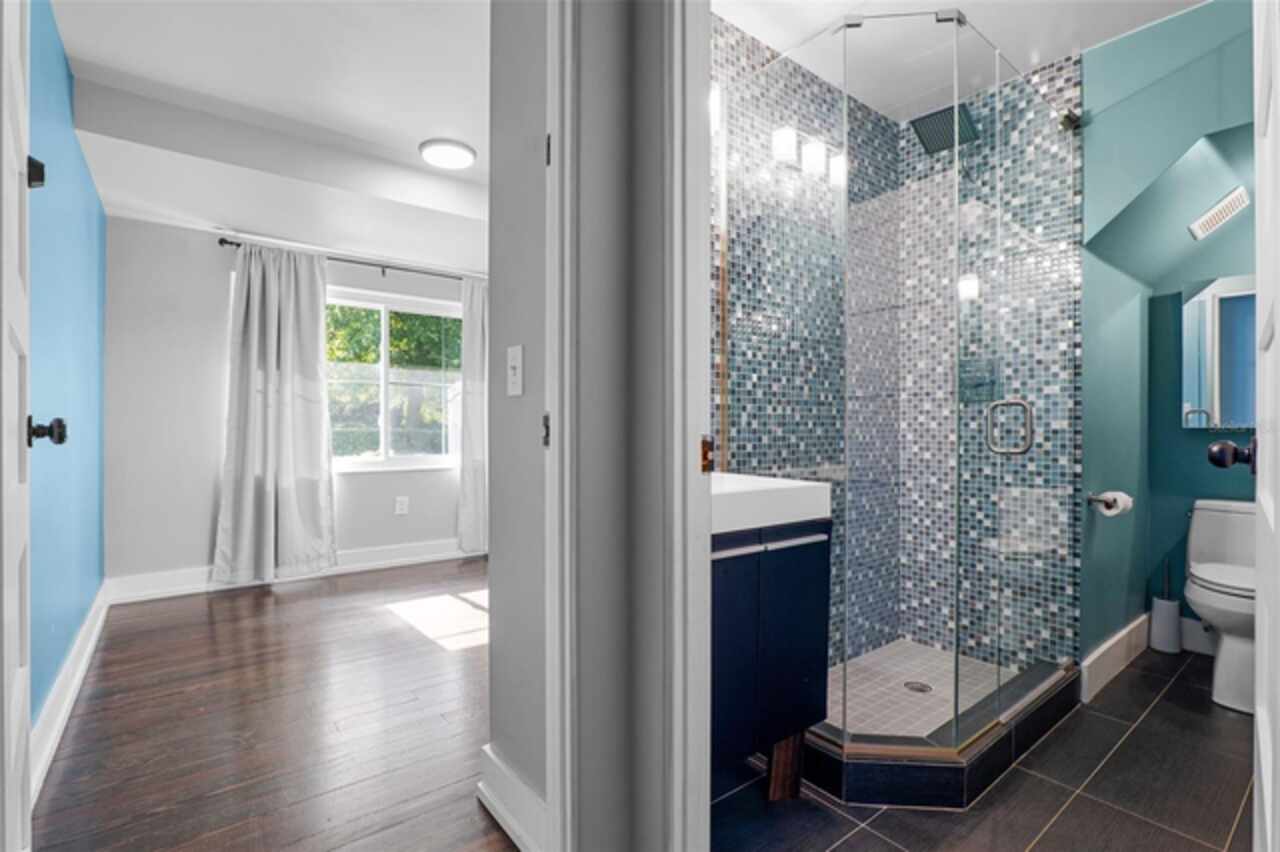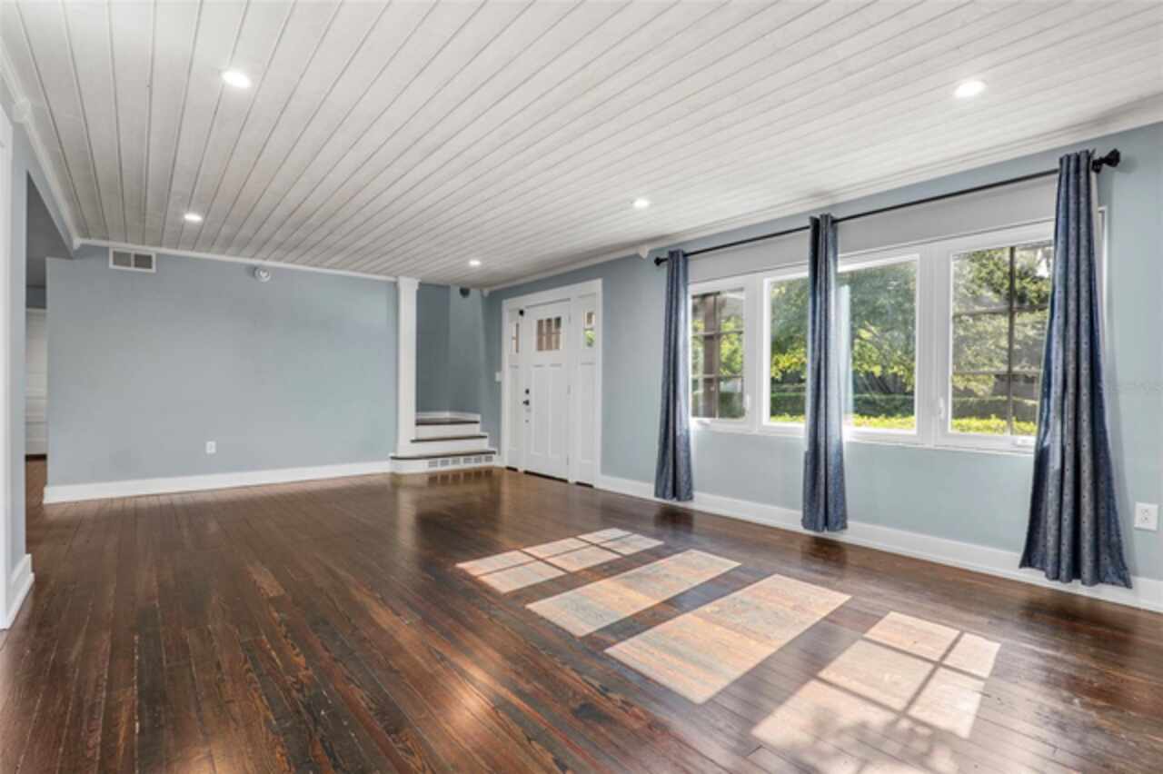 Step into timeless style with this beautifully maintained mid-century modern home sitting on a large 0.29-acre lot in the heart of Delaney Park, one of downtown Orlando’s most sought-after neighborhoods, and just stone’s throw from the 903 Mills Market and right around the corner from Lake Davis, where you can enjoy walking paths and views of the downtown Orlando skyline. Built in the 1950s, this home embraces the clean lines, thoughtful architecture, and organic flow that define the era, while offering modern updates and comforts you'd expect today. From the moment you pull into the half-circle driveway, the home draws you in with its understated curb appeal. Inside, the open living and dining room area, featuring rich wood floors and exposed beam ceilings, welcomes you with sunlight streaming through the updated windows. The kitchen blends classic and contemporary with quartz countertops, a farm sink, and custom espresso cabinetry. It is equipped with stainless steel appliances including a Frigidaire double oven and refrigerator, a cooktop, and a dishwasher. Just around the corner, a first-floor bedroom and updated full bath offer flexibility for guests, office, or multigenerational living. Right off the kitchen, you'll find access to the oversized two-car garage, complete with space for laundry and a built-in mudroom area. Head upstairs and discover the primary suite, nestled quietly in the northeast corner. It features custom built-in closet features and a spa-inspired bathroom with a rain shower and beautifully selected modern finishes, including Designer-grade Oceana Azul Tile. Down the hall, where the wall displays the original blueprints of the home, two additional bedrooms share another updated full bath, each room thoughtfully designed with comfort and style in mind. Step out onto the deck-style lanai and into your own private garden retreat hidden in the middle of the city. The large backyard is filled with mature trees, tropical landscaping, and plenty of room to play, relax, or entertain. It’s private, peaceful, and feels like a secret garden in the middle of the city. A shed out back adds practical storage without interrupting the natural beauty of the space. Recent upgrades include a new AC system (2022), updated electric and plumbing systems in recent years, and new windows (2018). With quick access to 408, I-4, and downtown’s thriving food and business scene, this home offers location and style. Homes like this, where architectural charm, updates, and a truly special yard come together, rarely come to market. Schedule your private showing today and see why this Delaney Park home is something truly special.