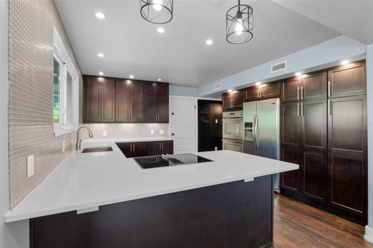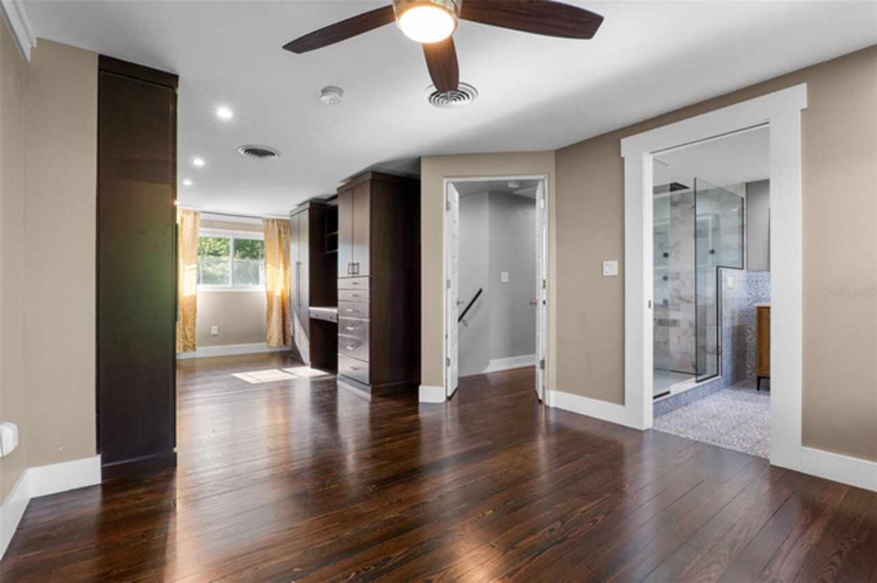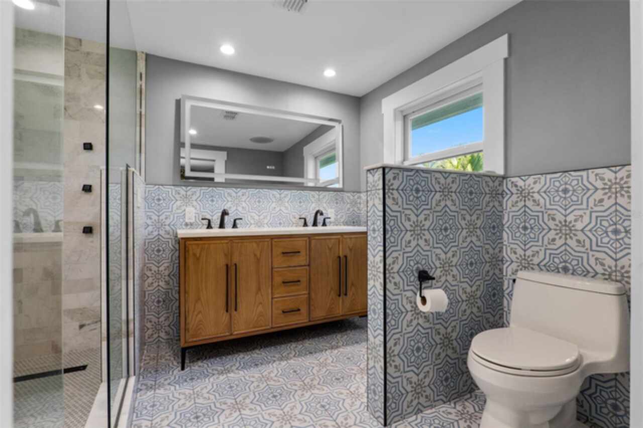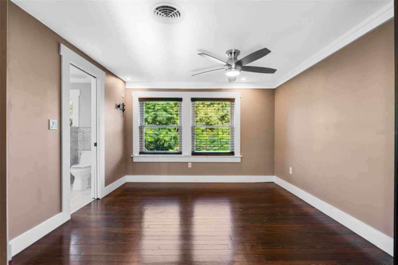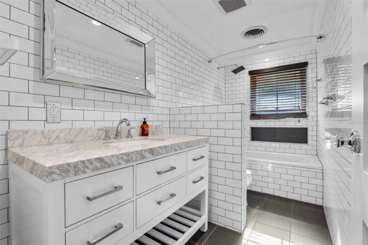 Step into timeless style with this beautifully maintained mid-century modern home sitting on a large 0.29-acre lot in the heart of Delaney Park, one of downtown Orlando’s most sought-after neighborhoods, and just stone’s throw from the 903 Mills Market and right around the corner from Lake Davis, where you can enjoy walking paths and views of the downtown Orlando skyline. Built in the 1950s, this home embraces the clean lines, thoughtful architecture, and organic flow that define the era, while offering modern updates and comforts you'd expect today. From the moment you pull into the half-circle driveway, the home draws you in with its understated curb appeal. Inside, the open living and dining room area, featuring rich wood floors and exposed beam ceilings, welcomes you with sunlight streaming through the updated windows. The kitchen blends classic and contemporary with quartz countertops, a farm sink, and custom espresso cabinetry. It is equipped with stainless steel appliances including a Frigidaire double oven and refrigerator, a cooktop, and a dishwasher. Just around the corner, a first-floor bedroom and updated full bath offer flexibility for guests, office, or multigenerational living. Right off the kitchen, you'll find access to the oversized two-car garage, complete with space for laundry and a built-in mudroom area. Head upstairs and discover the primary suite, nestled quietly in the northeast corner. It features custom built-in closet features and a spa-inspired bathroom with a rain shower and beautifully selected modern finishes, including Designer-grade Oceana Azul Tile. Down the hall, where the wall displays the original blueprints of the home, two additional bedrooms share another updated full bath, each room thoughtfully designed with comfort and style in mind. Step out onto the deck-style lanai and into your own private garden retreat hidden in the middle of the city. The large backyard is filled with mature trees, tropical landscaping, and plenty of room to play, relax, or entertain. It’s private, peaceful, and feels like a secret garden in the middle of the city. A shed out back adds practical storage without interrupting the natural beauty of the space. Recent upgrades include a new AC system (2022), updated electric and plumbing systems in recent years, and new windows (2018). With quick access to 408, I-4, and downtown’s thriving food and business scene, this home offers location and style. Homes like this, where architectural charm, updates, and a truly special yard come together, rarely come to market. Schedule your private showing today and see why this Delaney Park home is something truly special.